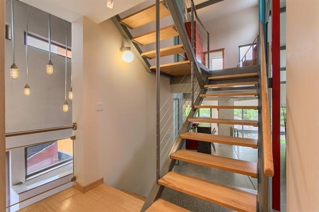 Modern wood & metal staircase keeps the light flowing from floor to floor